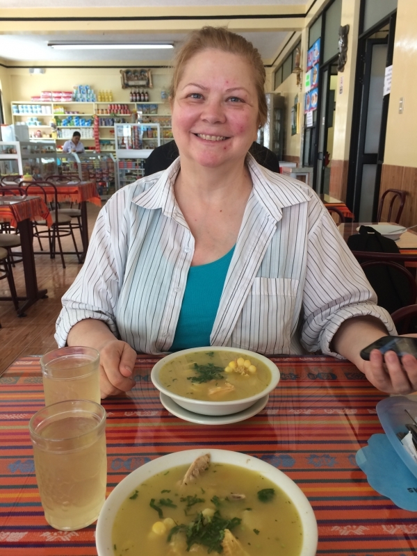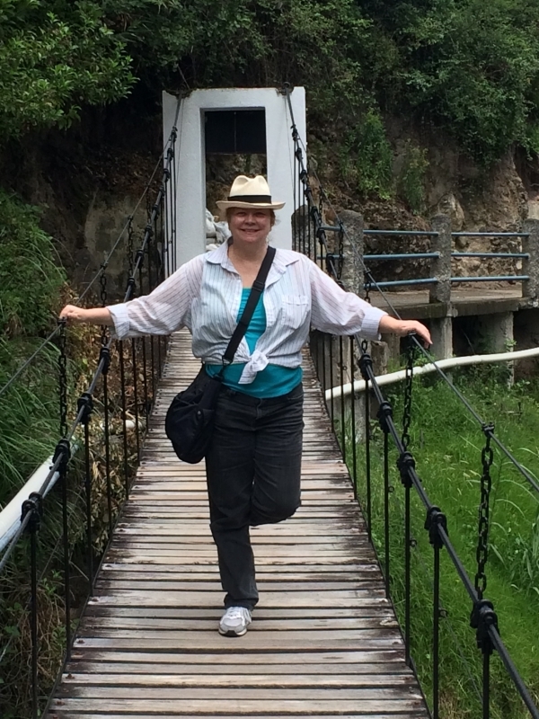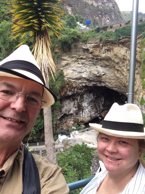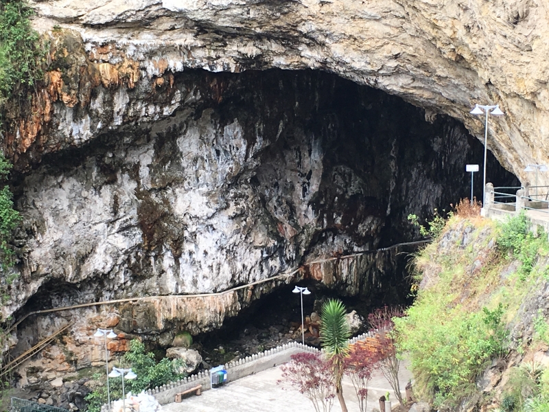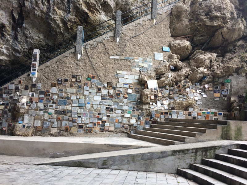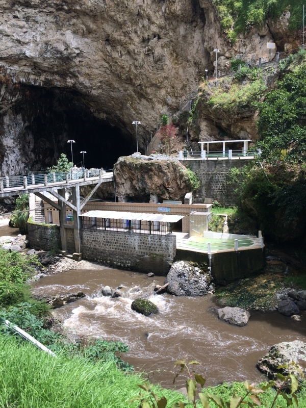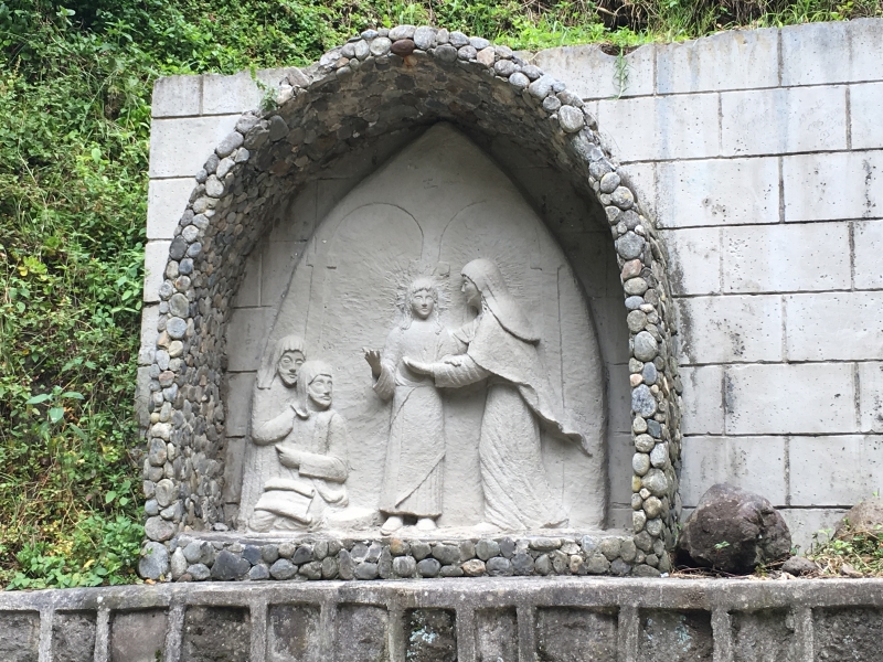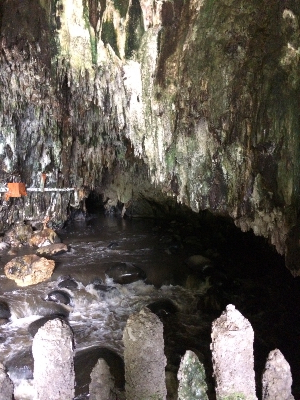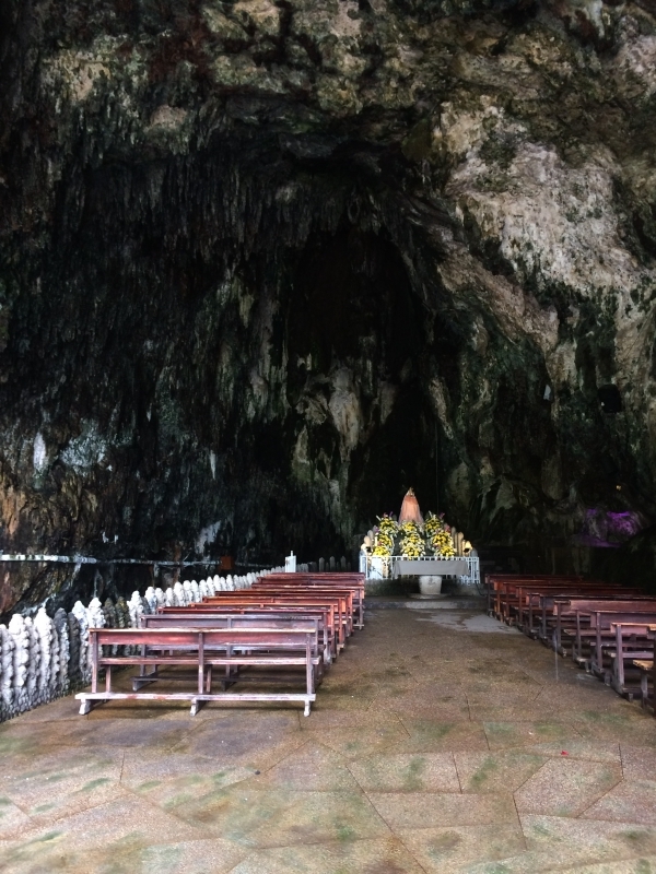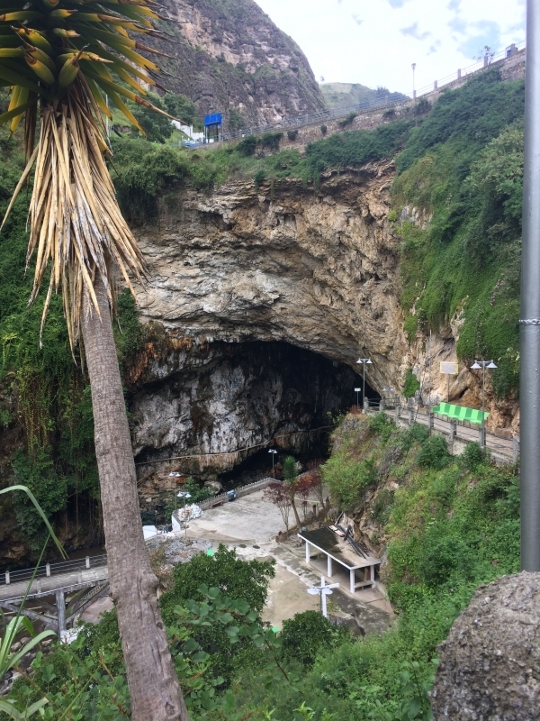 After the usual almuerzo (lunch) of soup with a main dish of chicken and rice, we headed out to find the grotto. There was a steep paved walkway that led us down into the bottom of the canyon that ended at this beautiful cave…..