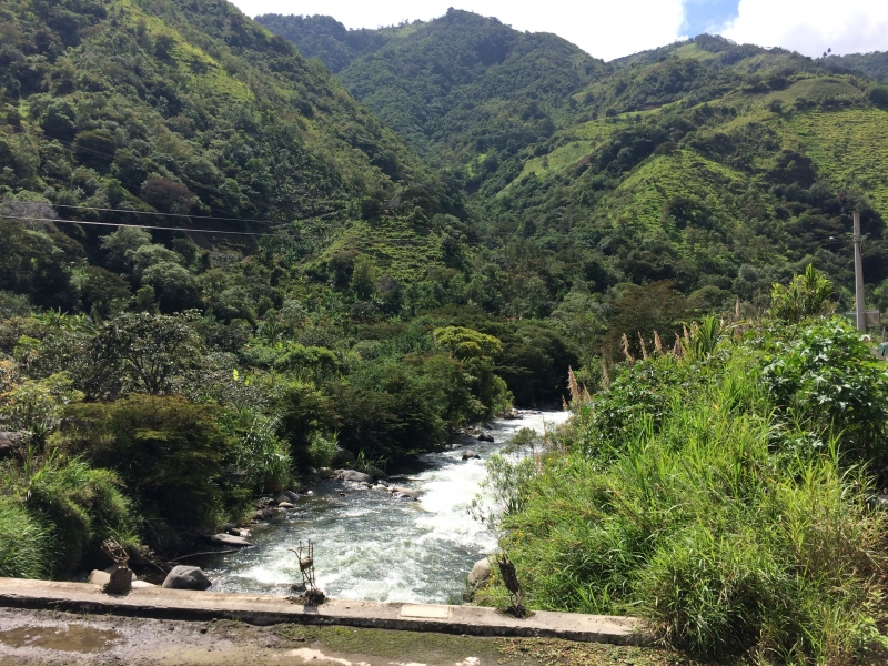 We passed through several small communities before coming to the bottom of the very narrow, winding valley floor. We dropped from over 12,000 ft to around 6,000 ft in about 30 kms of twisty, turny roads. The town of Apuela, the largest of these communities, is situated on the top of a narrow ridge above the Intag river. We got totally disoriented in this tiny town and ended up driving in circles around the central square until we finally figured out that one of the side streets was actually the way out, down a very steep road to the valley floor.