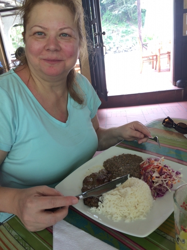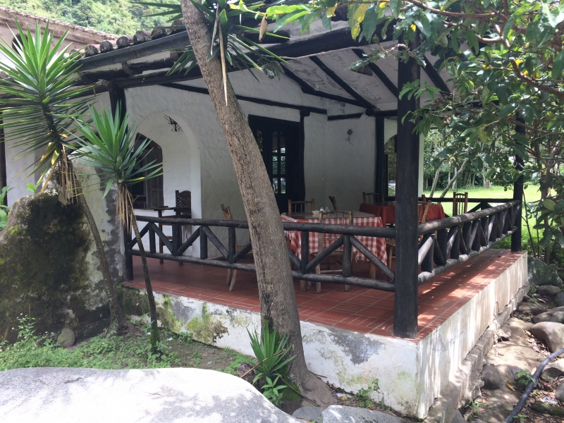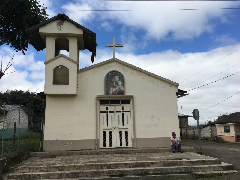 The next community down the river was Nangulvi. It is home to the Nangulvi Thermal Springs Resort. After passing it and thinking we could continue on all the way to Otavalo, we encountered the end of pavement and started up a very rocky, muddy, gravel road. Our GPS said we were on the right track, but our poor little Chevy Spark was getting beat up. After about 15km of this, we turned around and headed back to the resort for a nice lunch. Soup, a glass of fresh pineapple juice, grilled pork chop, rice, salad and lentils, all topped off with a poached banana covered in homemade caramel sauce – $3.50.