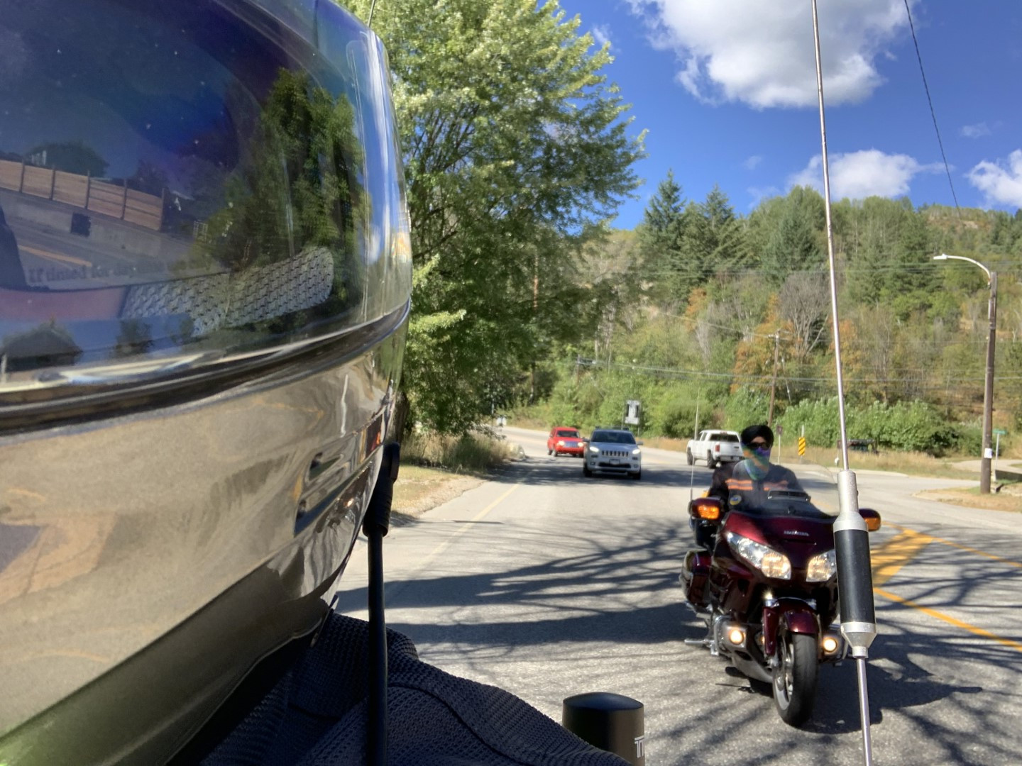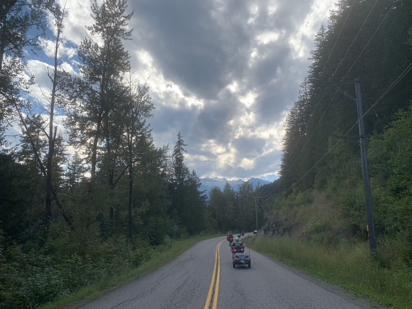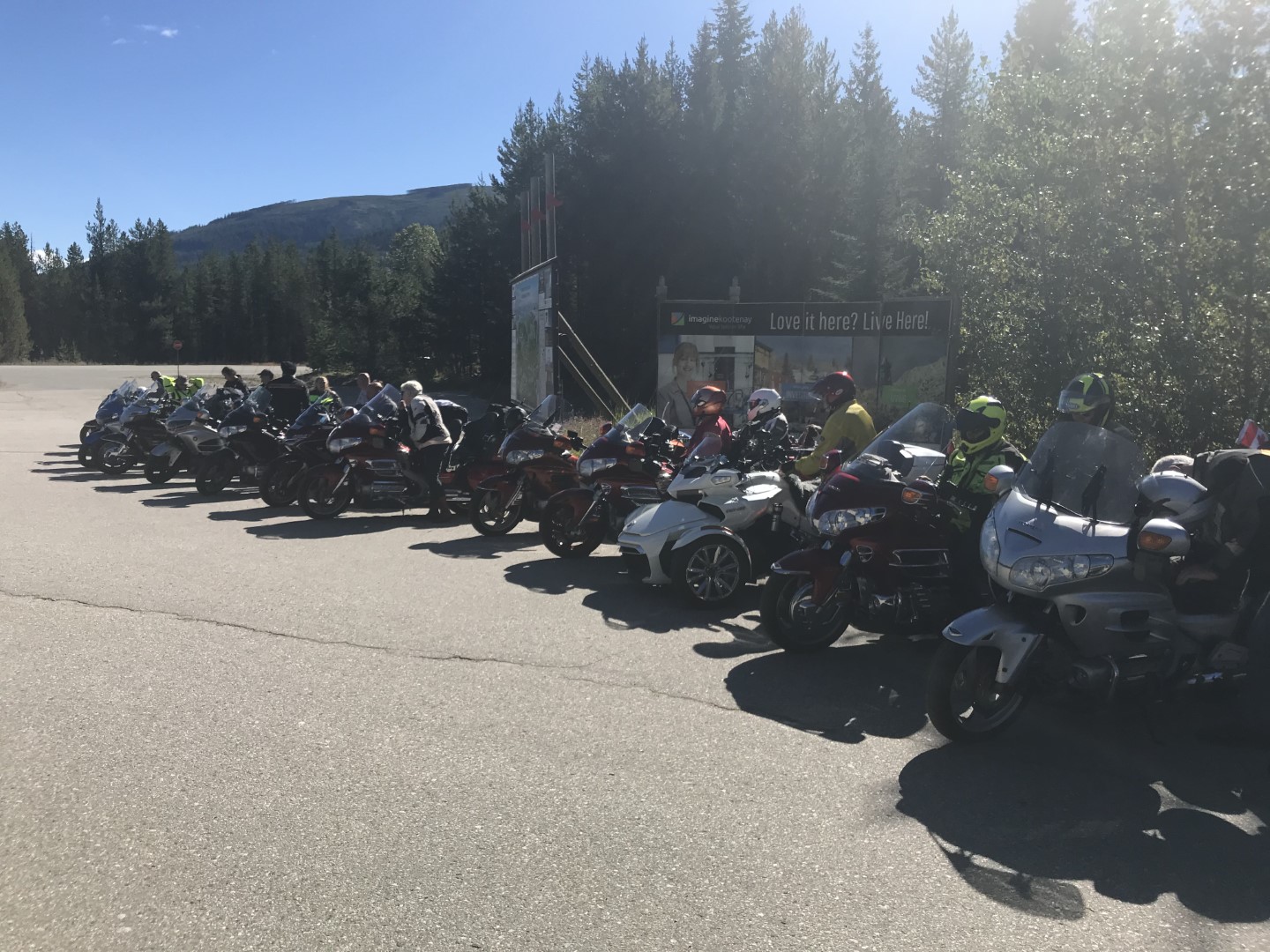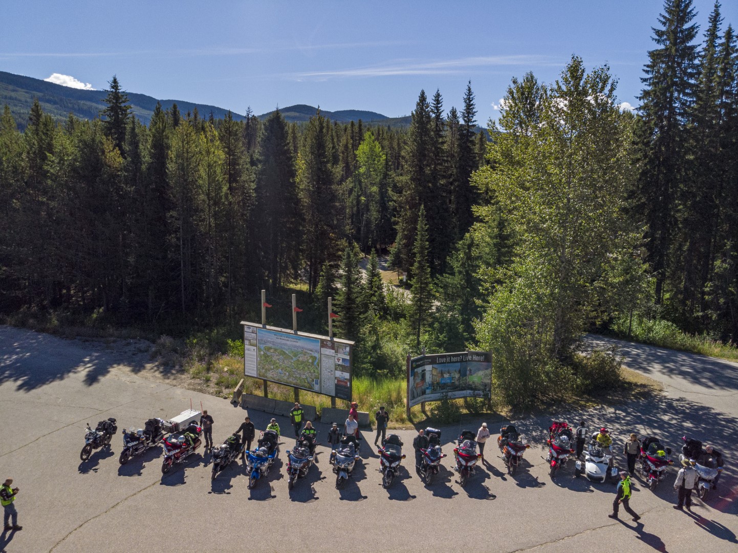 Day two of our adventure saw us heading out over Paulson Pass towards Castlegar. The riding group from the Victoria chapter caught up with us the night before and we decided it would be a great opportunity for a photo op at the turnoff to Trail close to the summit. Vivek had a drone and also took a few awesome shots…