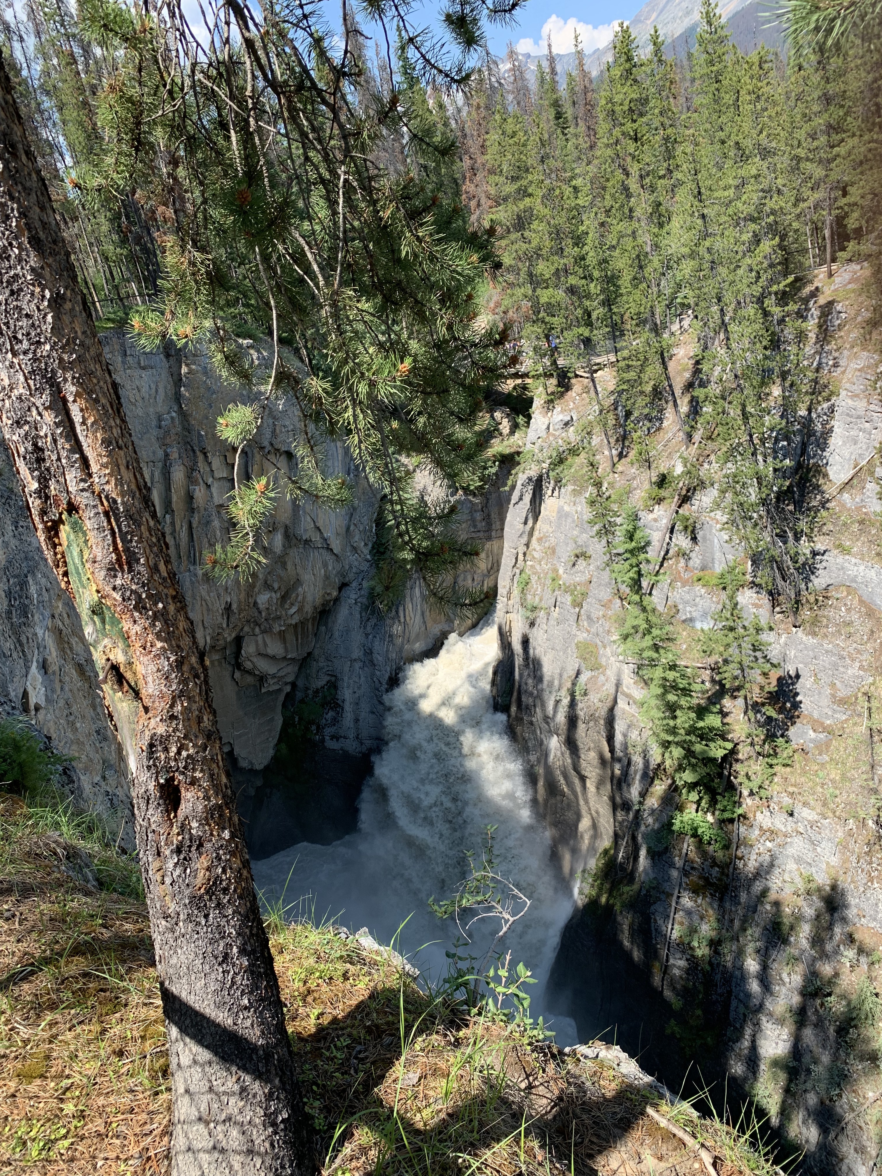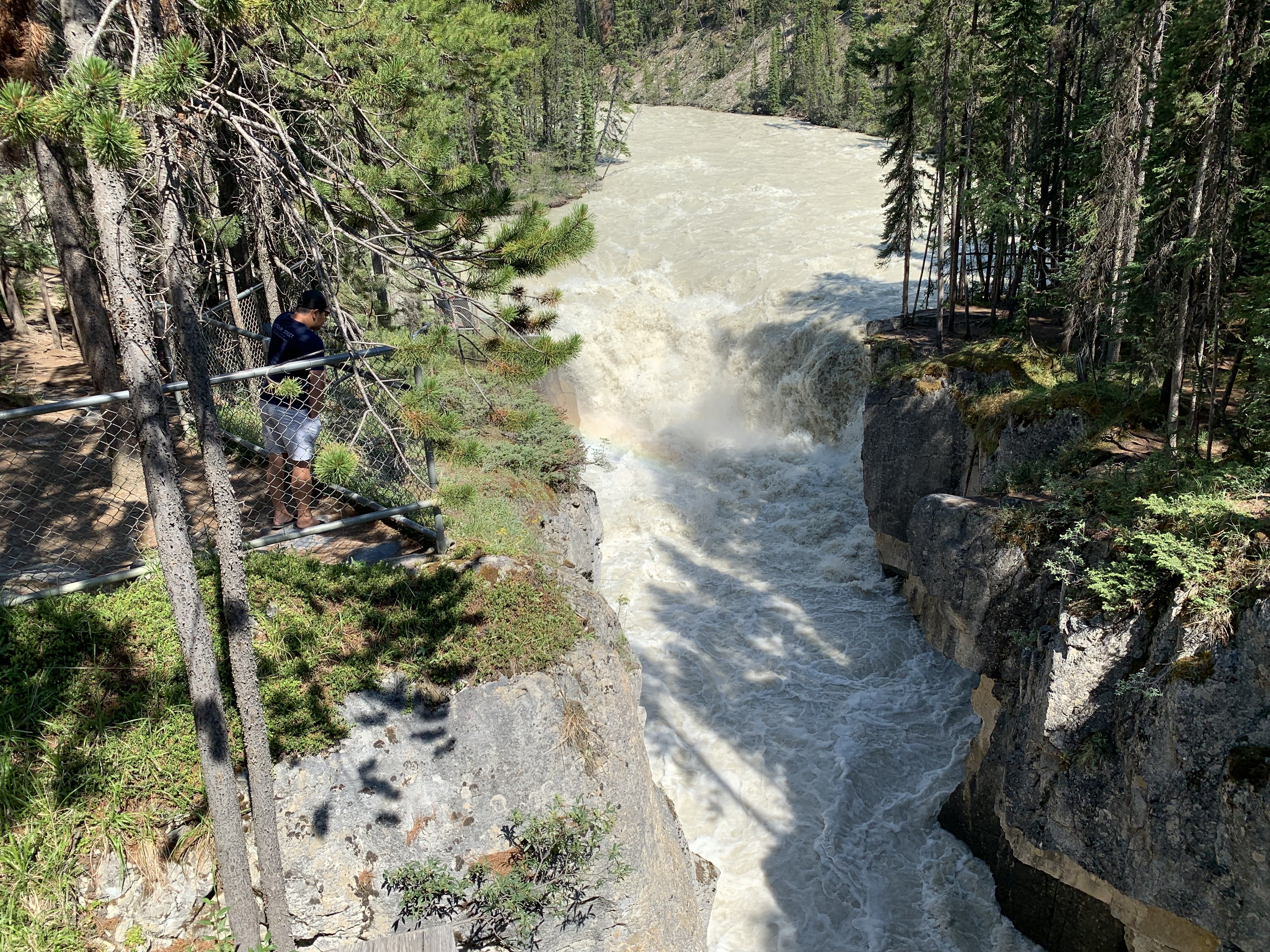 The lodge is located close to Sunwapta Falls. It is a rustic collection of cabins tucked into the forest beside the highway. There is no A/C (it was +30 when we arrived), it is expensive ($200+), but has an excellent dining room. The food was 5 star all the way.