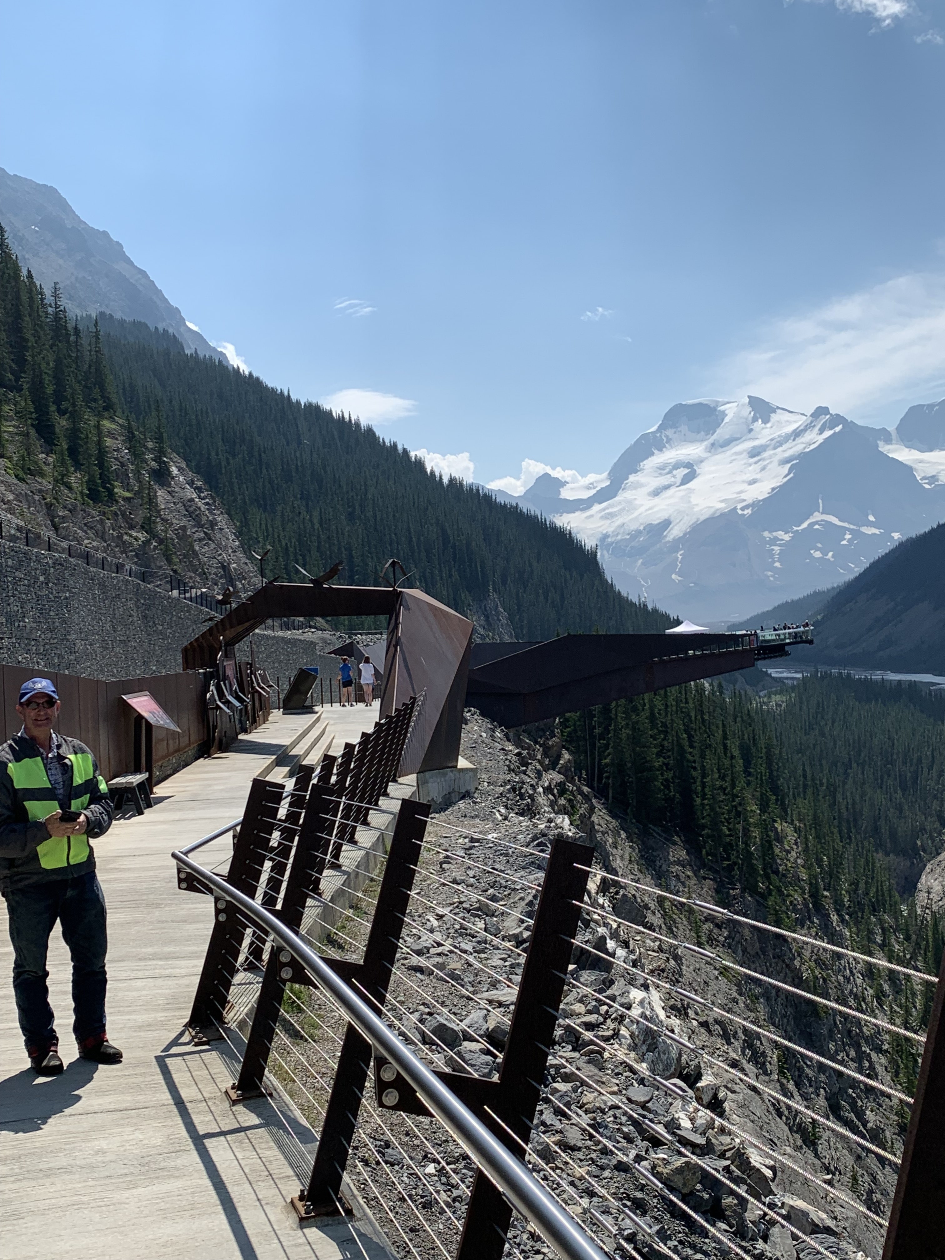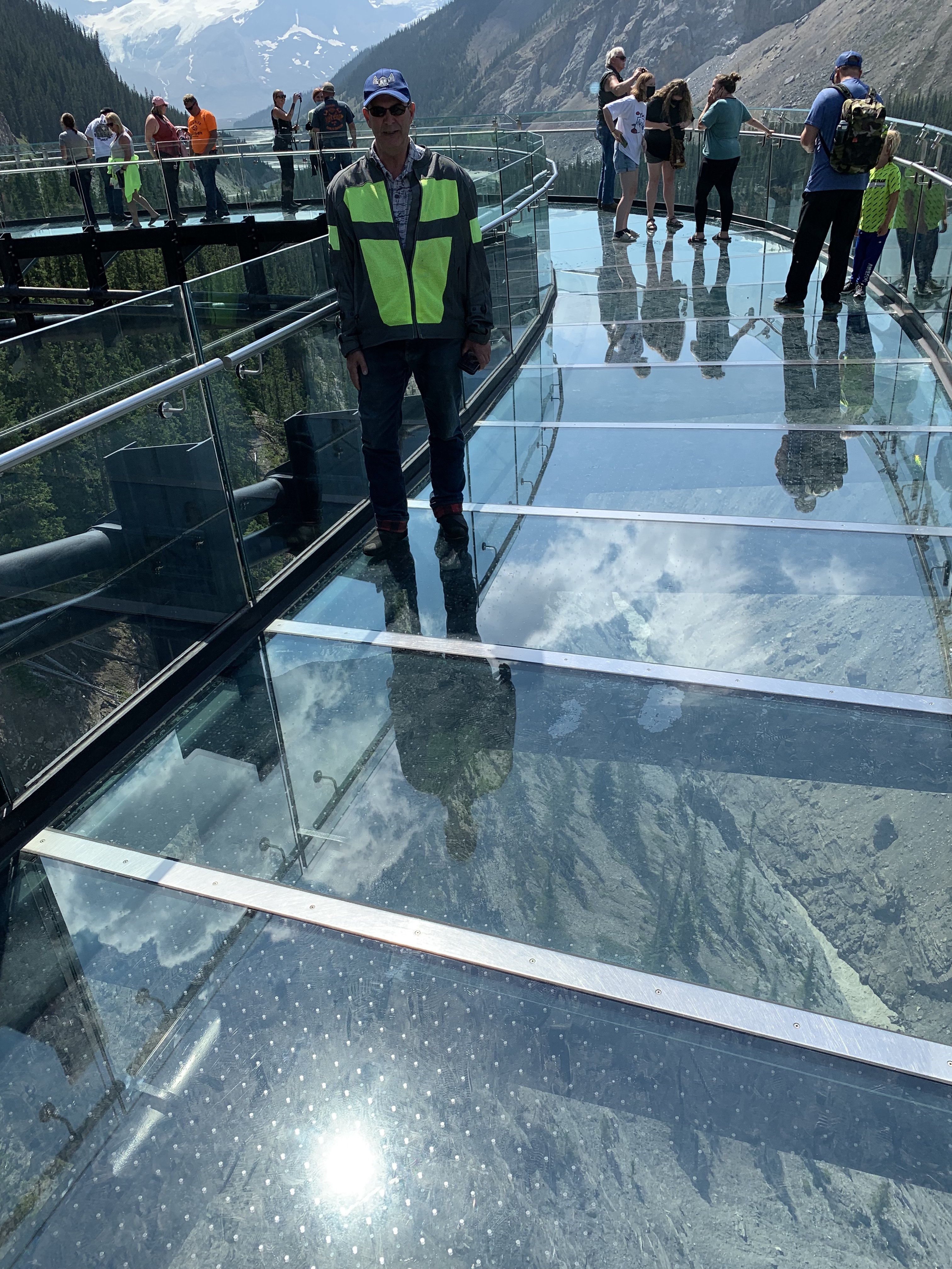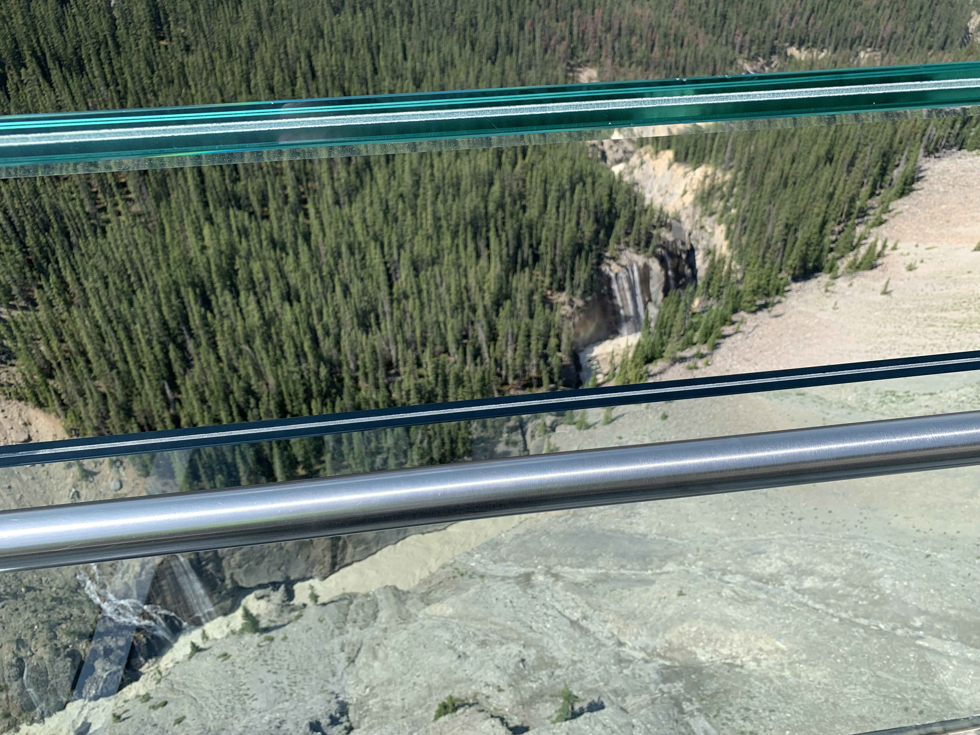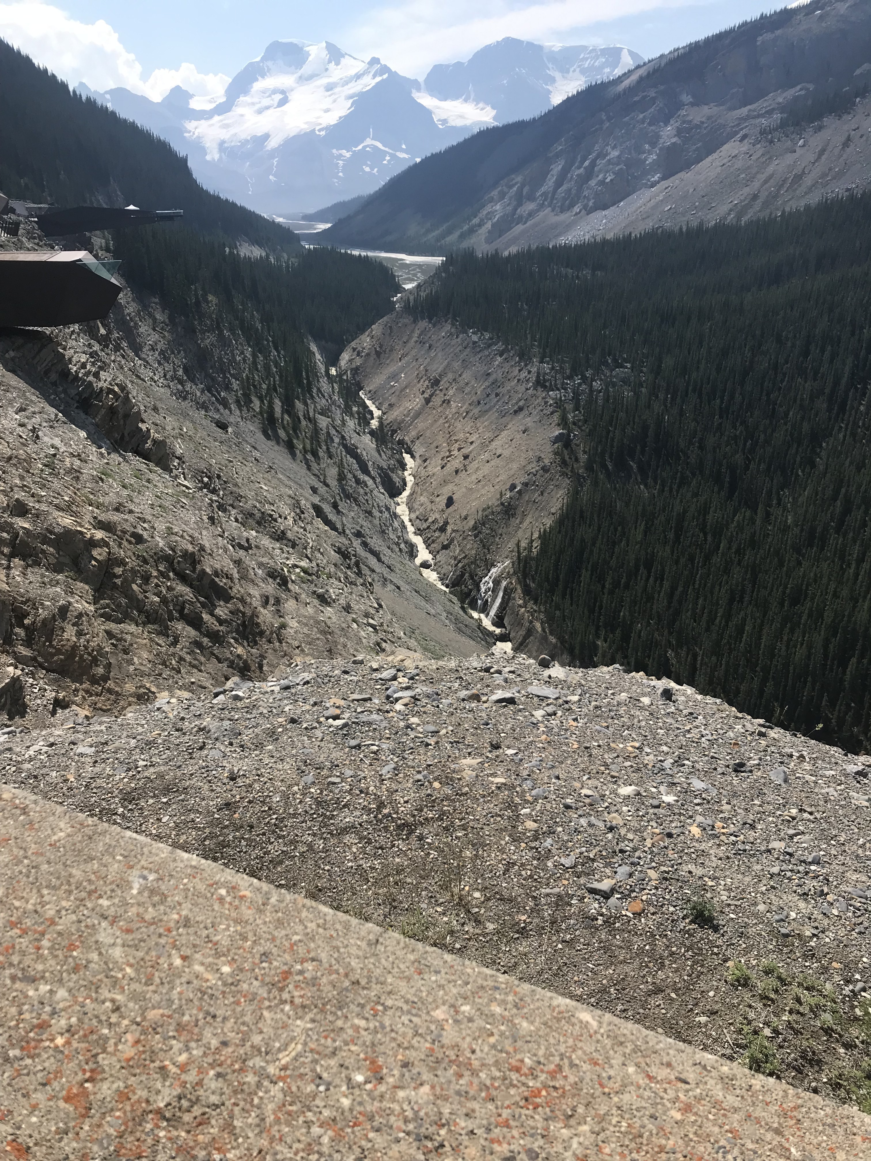 After the Glacier Tour, we were whisked onto another bus and taken to the Columbia Icefields Skywalk. If you are scared of heights, this may not be for you. This is a glass bottomed bridge erected on the side of a cliff overlooking a river gorge several hundred feet below. It is quite spectacular.