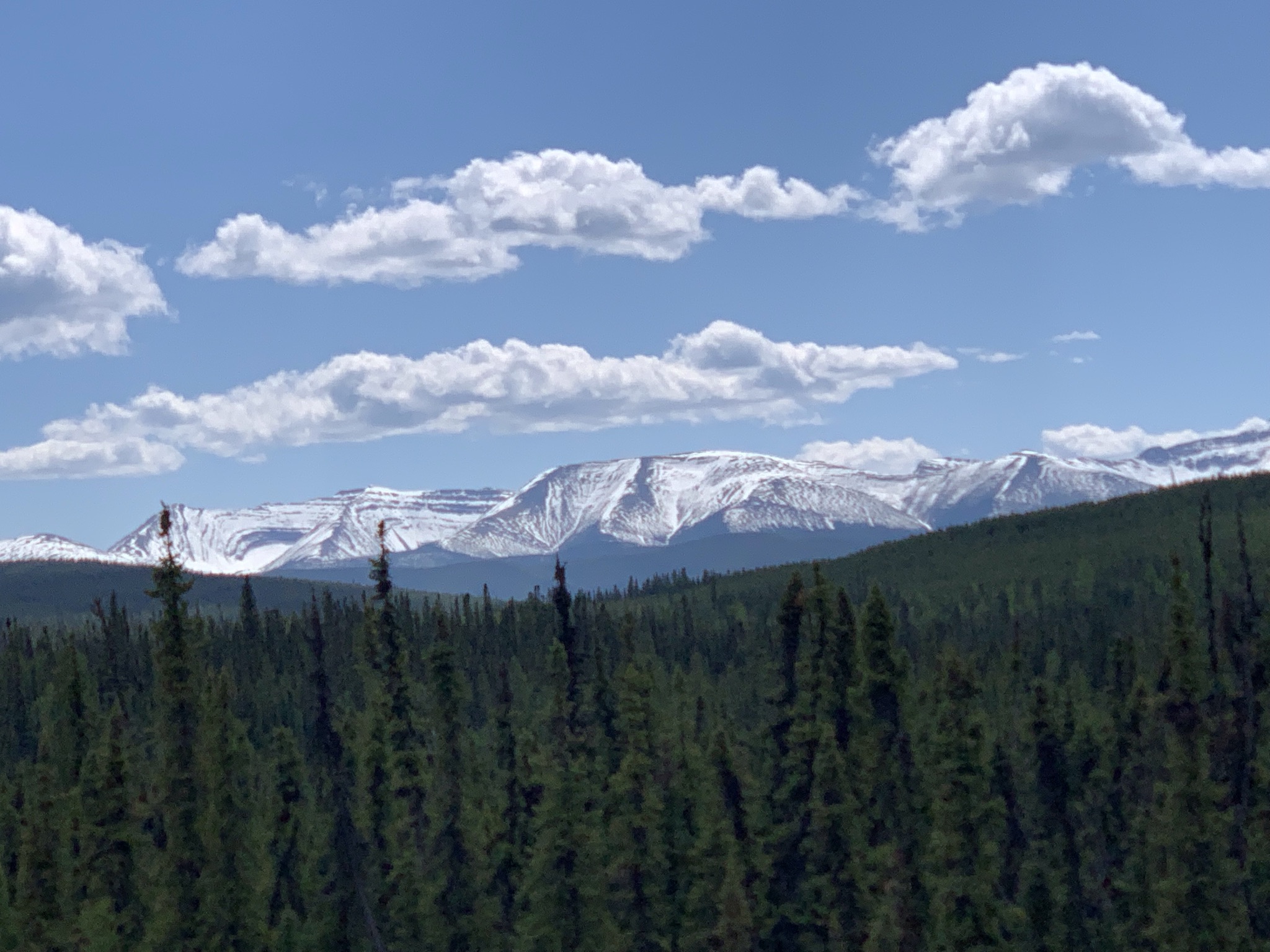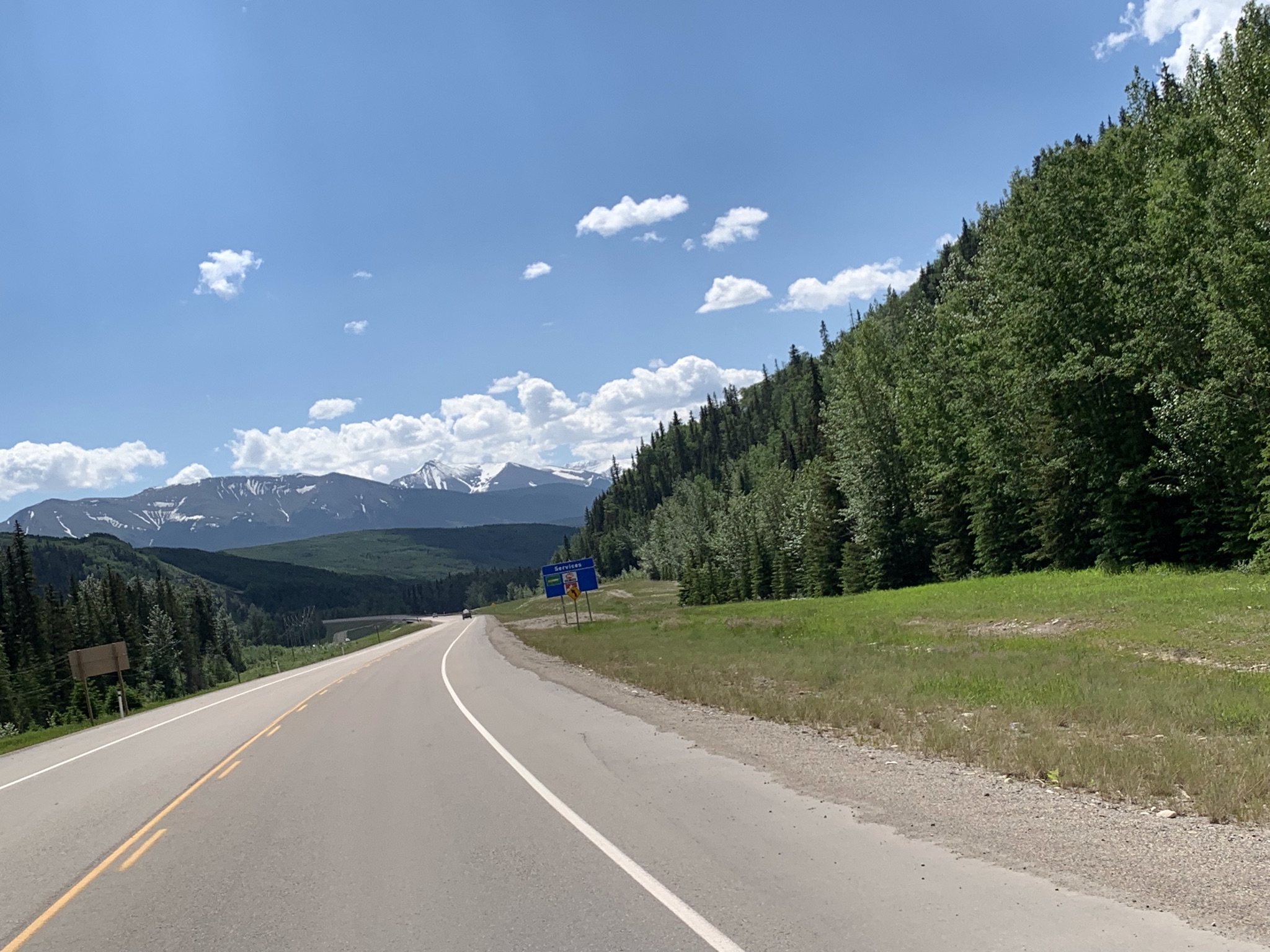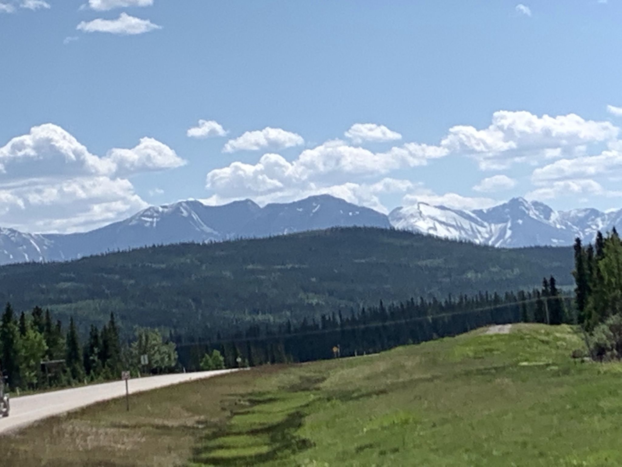 The route out of Dawson took us away from the mountains and out into the prairies of northern Alberta. We fueled up in Grand Prairie before heading south and west towards Hinton. Rolling hills were the views of the day with the Rocky Mountains looming behind……