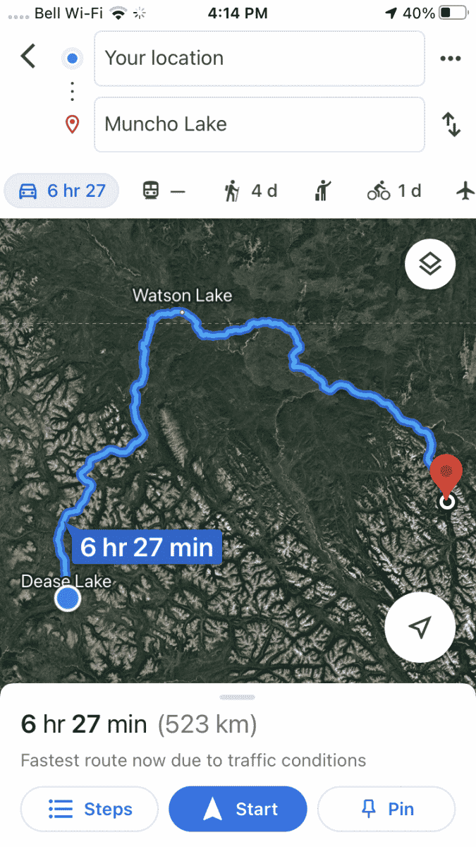 Doug and I left the ladies with the bike and we headed into Watson Lake. I got cell service and called GWRRA roadside assistance. At the same time we headed to the nearest auto parts store to see if maybe they had an alternator – no luck there. The Rescue Plus program with the GWRRA was able to send a tow truck out to the site. It arrived at the same time as we did. By this time, the bike had sat long enough for the battery to recover and started up. I rode it into town before it stalled again. The tow operator (BJ’s Towing) hooked up to the battery with jumper cables and charged the battery for a bit until the bike started again and I followed him to his shop.