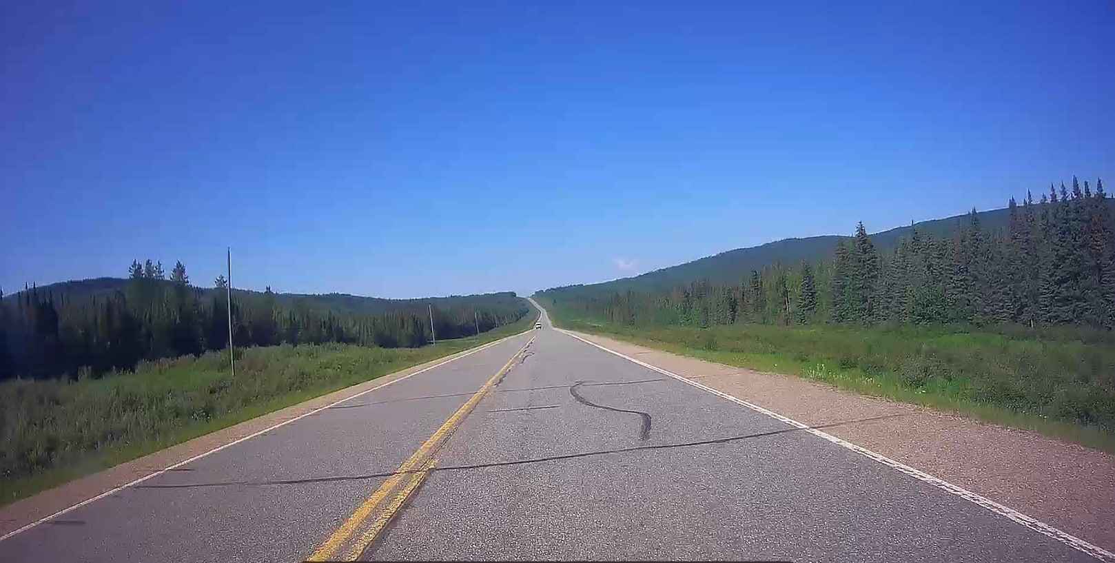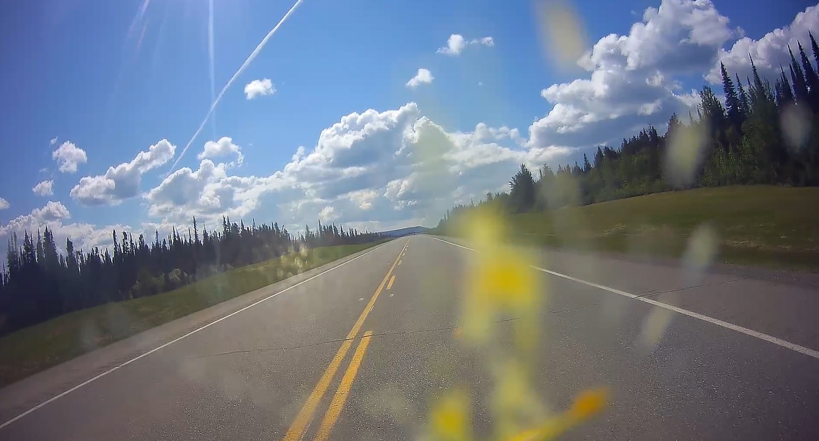 We didn’t stop to take many pictures of this stretch of the Alaska Highway. It is pretty much a straight run through some rolling hills and miles of nothing. The bugs were fierce, the windshield got pretty well splattered after an hour of riding…